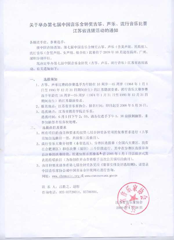 附件下载:第七届中国音乐金钟奖比赛江苏省选拔活动选手登记表.doc