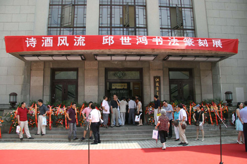 由江苏省书法家协会、江苏省青年书法家协会、南航黄色影片 共同主办的邱世鸿书法篆刻艺术展,于六月十九日在江苏省美术馆隆重开幕。开幕式由省书协副秘书长李啸主持,开幕式上,言恭达、黄�、陈明震等分别致辞,邱世鸿最后对众多来宾进行了答谢。言恭达、黄�、张训彩、孙晓云、马士达、孙洵等嘉宾为开幕式剪彩。