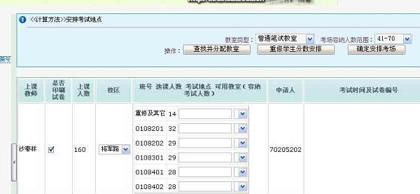 9) 对于上课人数太多或重修生需单独安排考试地点的,请点击“重修学生分散安排”,后,再点击“查找并分配原则教室”。