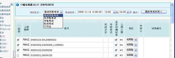 5) 在图二窗口的“选择”列中,选择参加考试班级。最后点击“确定考试时间”按扭,完成课程考试时间的申请。