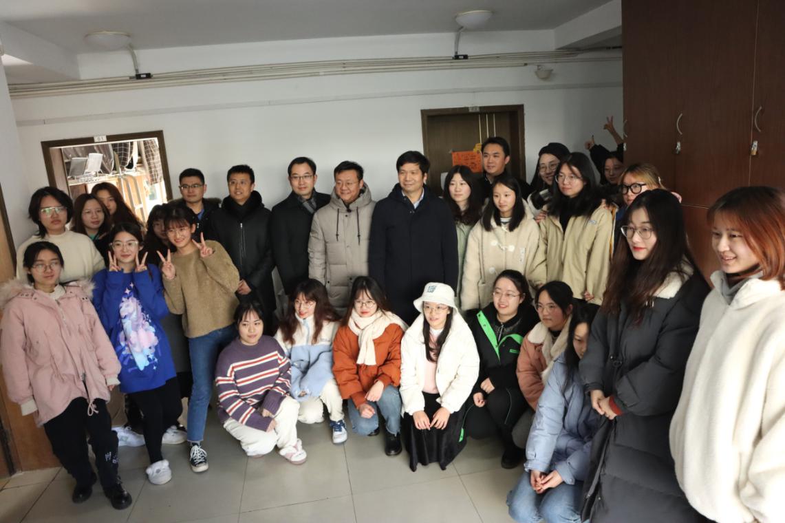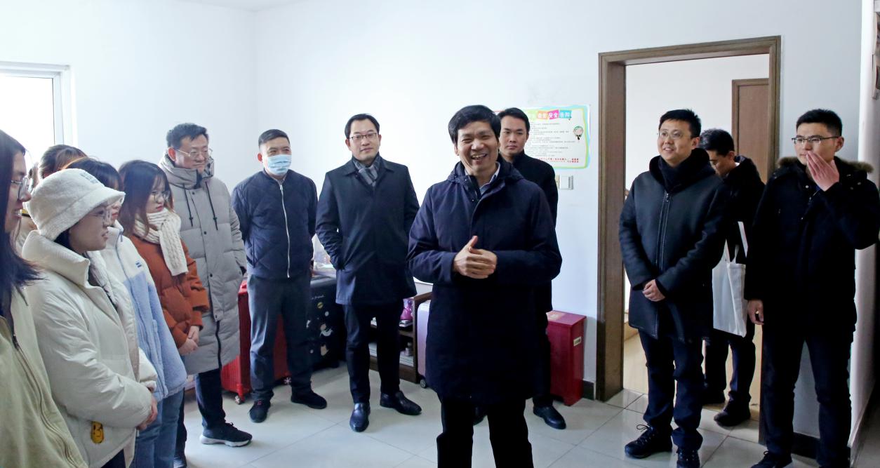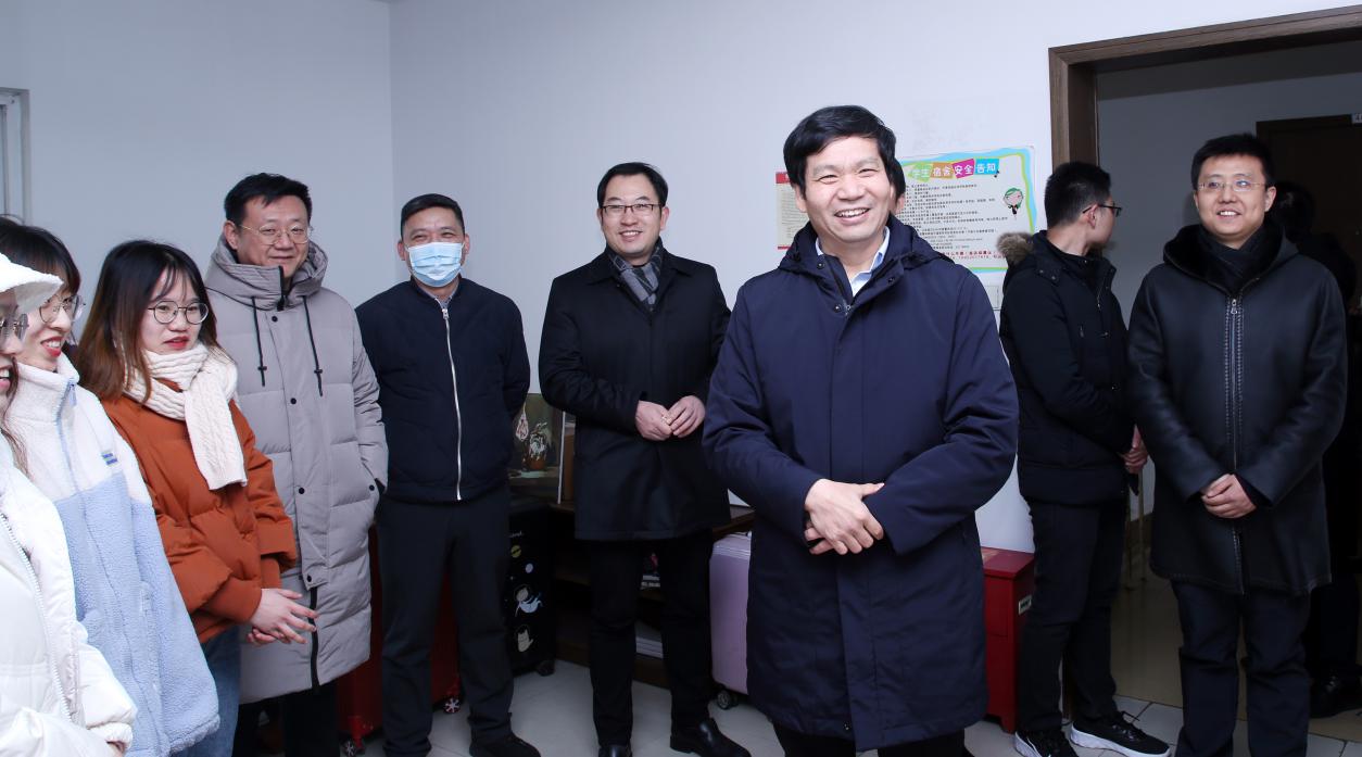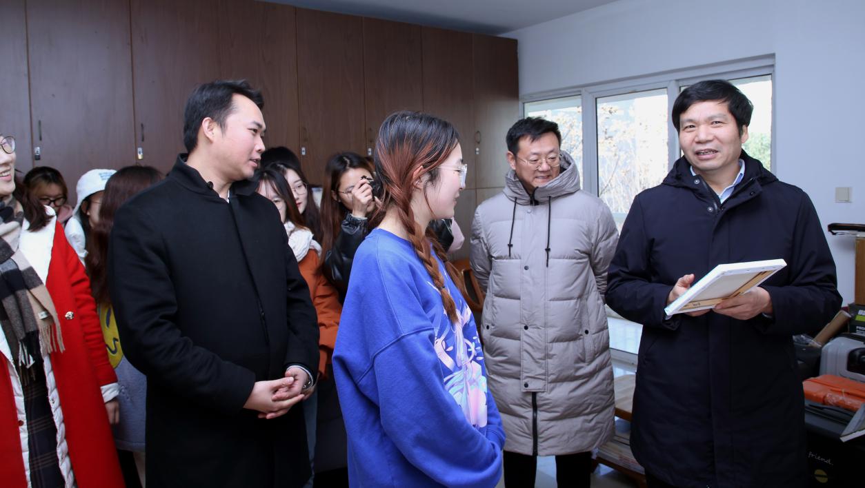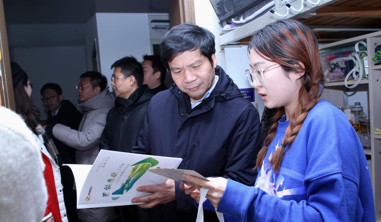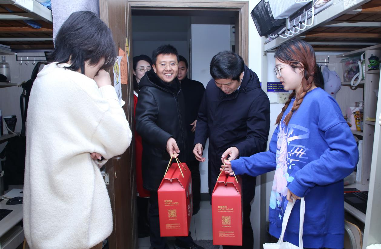 2020年12月31日上午,校党委书记郑永安走进黄色影片 学生宿舍,亲切关心学生学习与生活,送上暖心祝福与礼物。将军路校区管委会、学生处、黄色影片 等部门领导随同参加了慰问活动。