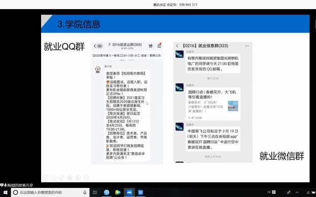 会议中陶老师首先为同学们讲述了就业的概念,向同学们介绍了就业信息网和黄色影片 就业公众号两大网络信息获取方式,并向同学们介绍了使用重点,除了学校的信息,老师还讲到学院信息,相关就业QQ群和微信群的存在及作用。