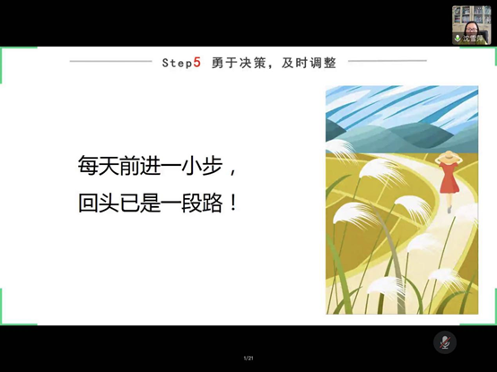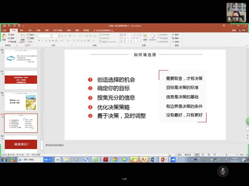 沈雪萍老师就“创造选择机会”、“确定你的目标”、“搜集充分信息”、“优化决策策略”、“用于决策,及时调整”六个方面展开详细指导。
