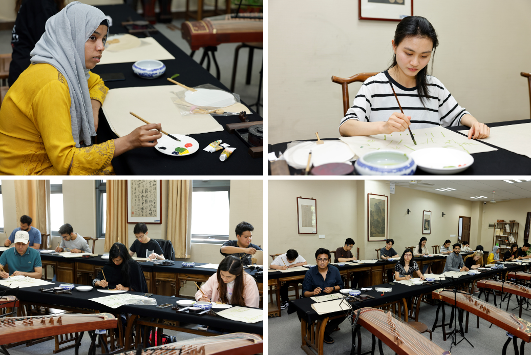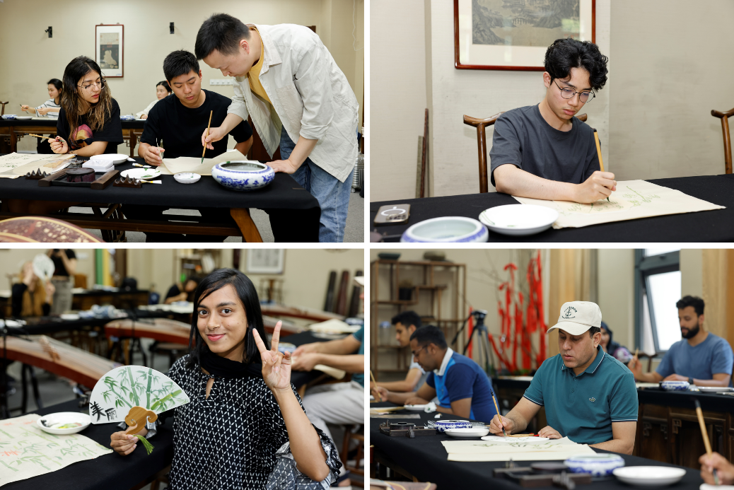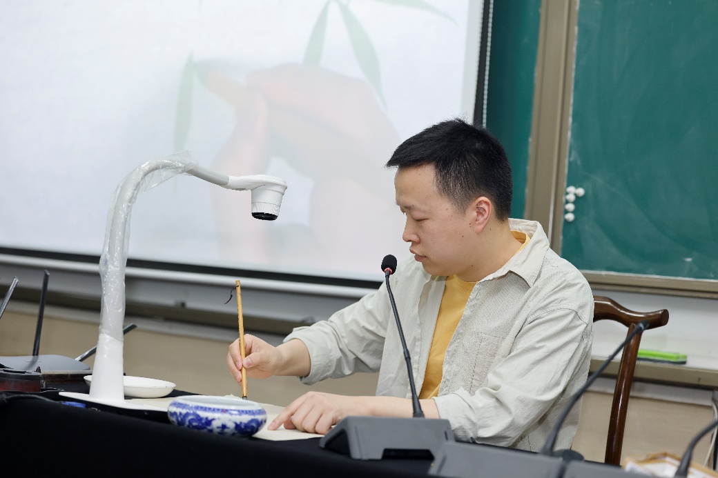 画笔描绘美好未来,色彩绘就壮丽人生。此次国画课由砚湖书院国画课教师潘杨进行授课。潘老师从国画题材和技法展开,深入浅出地讲授基础国画艺术理论、解析作品艺术风格与创作方法,着重介绍了什么是写意画,如何读懂一幅写意画。“写意绘画实践只需要几分钟,但可能需要十几年的学习积累去体现那几分钟,今天就教大家画竹,希望大家能通过这次的绘画创作感悟到更深长的意蕴。”梅、兰、竹、菊是中国人感物喻志的象征,号称花中四君子,其中,竹“筛风弄月,潇洒一生,清雅澹泊”是为谦谦君子,宋代苏轼也感叹“宁可食无肉,不可居无竹”。老师选择竹进行写意画教学,一方面是希望留学生能更好地感受到中国文化,另一方面也是对大家的美好祝愿:希望留学生们为人谦谦君子,学业节节高升。