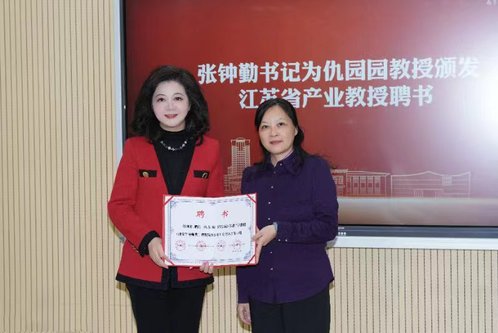 党委书记张钟勤为仇园园颁发江苏省产业教授聘书。
