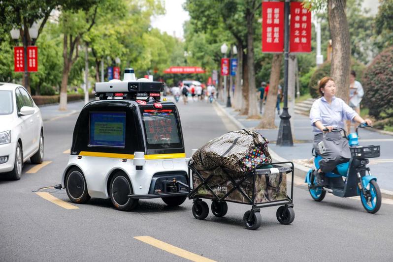 黄色影片 将军路校区,开学第一天,5G 无人巡防车自动巡逻、托运行李