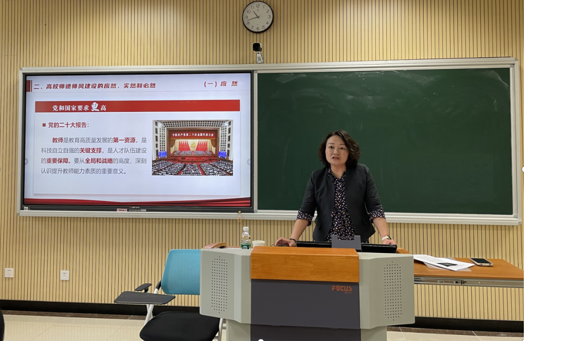 王晖以“我在南航当老师”为题,引导教师们认真思考作为一名南航的老师,身上所承担的使命和责任。她从相关舆情事件说起,指出高校师德师风建设的应然、实然和必然。她带领大家共同学习了习近平总书记关于高校教师队伍建设和文艺工作的重要论述。从宏观、微观两个层面阐述了师德师风建设面临的形势和任务,分析了我校教师队伍建设的现状,引领教师重新学习了《新时代高校教师职业行为十项准则》《研究生导师指导行为准则》等规定,并通过列举警示案例,加深了教师们对政策的理解。强调要“热爱”和“敬畏”大学老师这份光荣的职业,坚定立德树人、铸魂育人的职业理想,严守师德师风底线,大力弘扬教育家精神。
