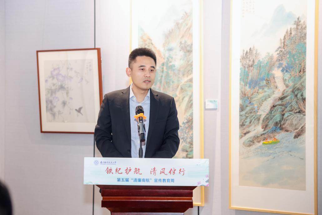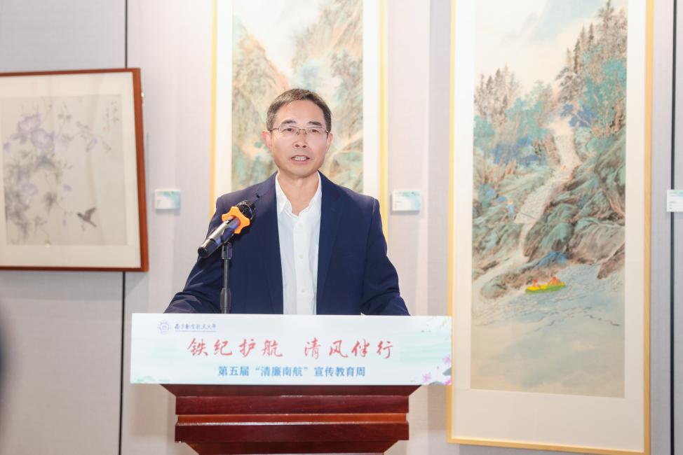 杭育新致开幕词并为获奖单位颁发荣誉证书。他在致辞中指出,学校坚持抓好校园清廉文化建设,以“清廉南航”教育周为抓手,通过持续的宣传教育,为师生们打造风清气正、干事创业的良好环境。本次廉洁文化作品联展中学校师生以书法、绘画、设计、摄影等多种方式进行廉洁主题艺术创作,充分展示了学校干部廉洁从政、教师廉洁从教、职工廉洁从业、学生廉洁修身的廉洁文化建设成果,是学校又一个有助于师生抬头见廉、低头思廉的沉浸式教育场所。他希望充分发挥联展的教育、示范、熏陶作用,潜移默化引导干部师生强化廉洁意识、提升文化修养。