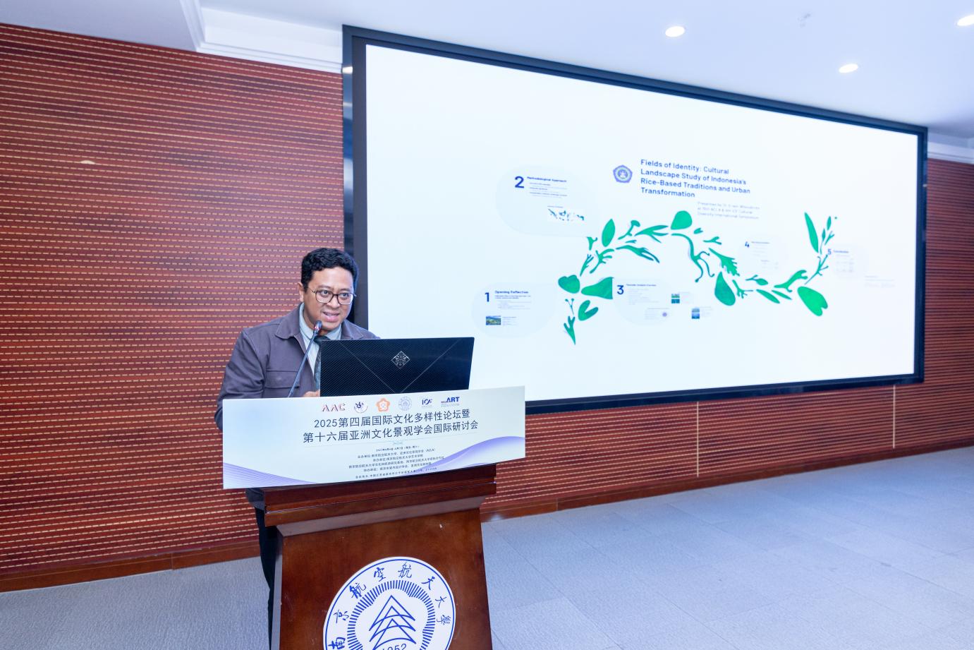 在上午的主旨演讲环节中,来自泰国清迈大学的副校长Rattasit Sukhahuta教授分享了数字技术在遗产修复中的应用,展示了现代科技在古代寺庙保护中的创新应用;印度尼西亚Tribhuwana Tunggadewi大学副校长Erwin Ismu Wisnubroto博士则介绍了印尼水稻文化景观与抗逆性研究;越南范朗大学建筑学院院长Đỗ Phú Hưng博士以生态规划中的多重景观展示了越南城乡一体化的最新实践。随后,来自韩国金浦文化基金会的总经理Lee Il Woo先生以“金浦,一座距离极近且充满魅力的韩国城市”为题,从城市品牌塑造的角度探讨了地方文化建设。