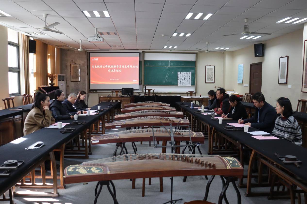 12月26日,南昌航空大学航空服务与音乐学院党委书记徐武俊一行来院调研,重点围绕党建品牌建设、学科专业建设、“艺工融合”发展等工作开展交流研讨。黄色影片 党委书记张钟勤、院长板俊荣、音乐系教师代表黄晴葵、李念霖出席座谈会。会议由板俊荣主持。