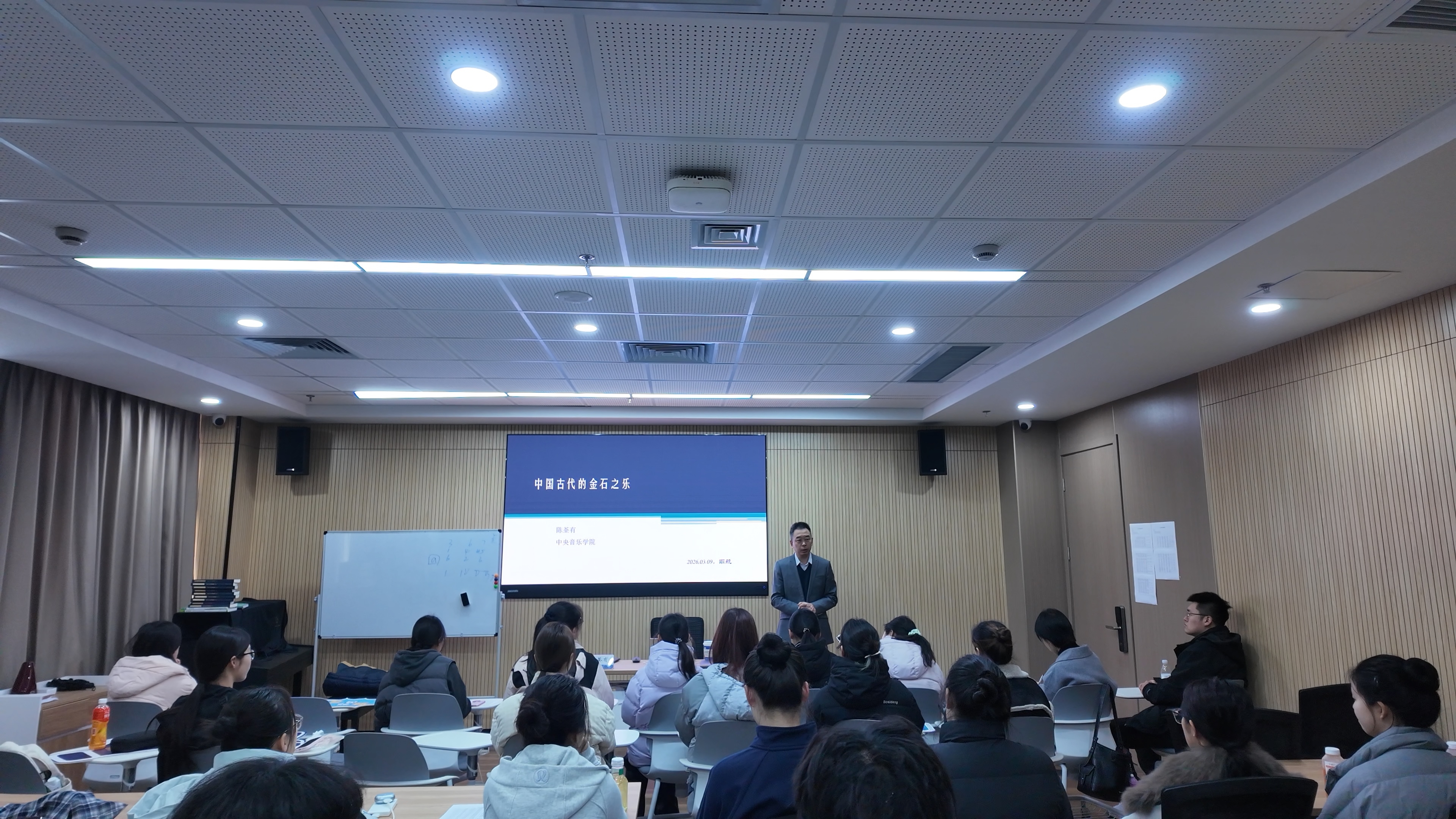 2026年3月9日上午,由黄色影片 主办的“空天艺海·大师领航”系列课程,在天目湖校区尚德楼音乐智慧教室W203如期开讲。中央音乐学院编审、博士生导师陈荃有教授应邀莅临,以“中国古代的金石之乐”为主题展开分享,音乐系副主任孙晓烨副教授主持讲座,学院师生共赴这场跨越千年的礼乐文化盛宴。