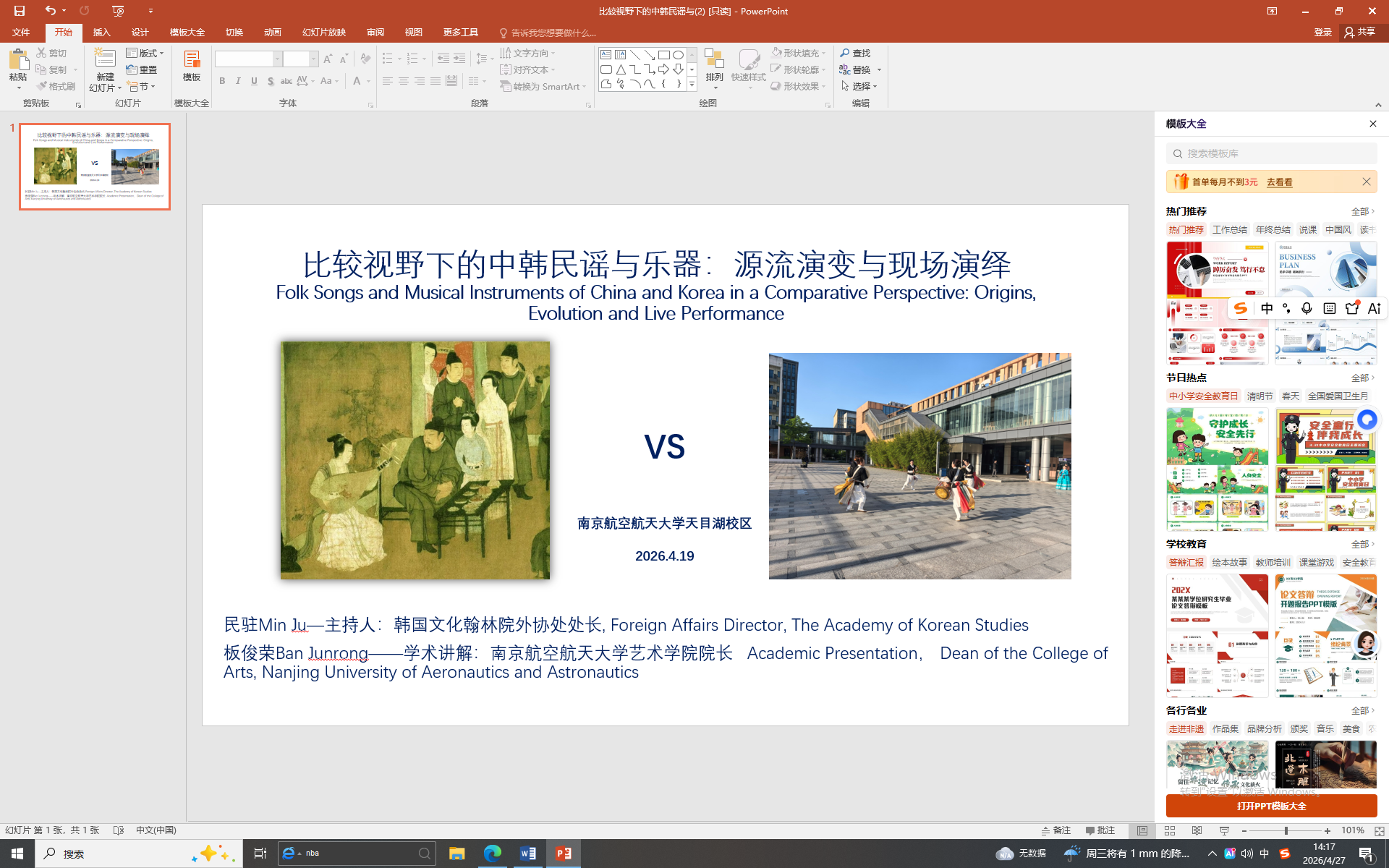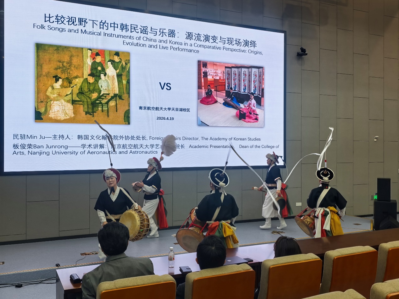 4月19日晚,在我校天目湖校区尚德楼一楼报告厅成功举办了一场别开生面的中韩传统音乐文化交流讲座音乐会,本次活动由韩国亚洲文化翰林院外协处处长民驻先生主持,黄色影片 板俊荣教授主讲。音乐会的表演任务由来自韩国两个传统非遗乐团的部分成员及受邀的我国民歌和民乐演奏者承担。现场表演无比精彩,掌声不断。